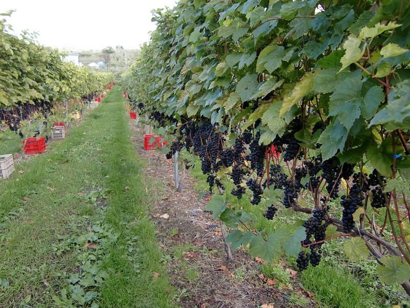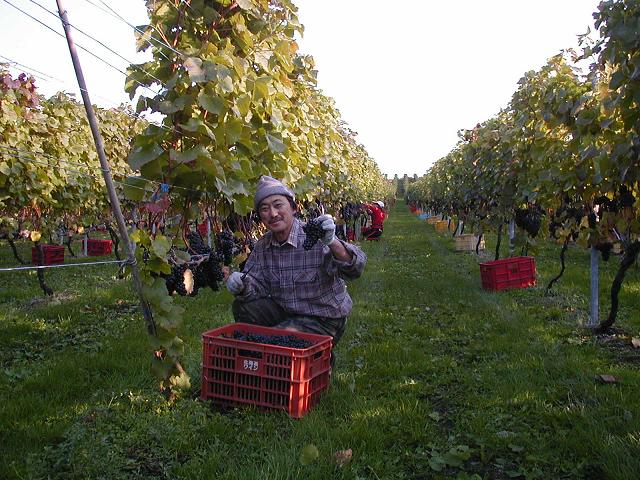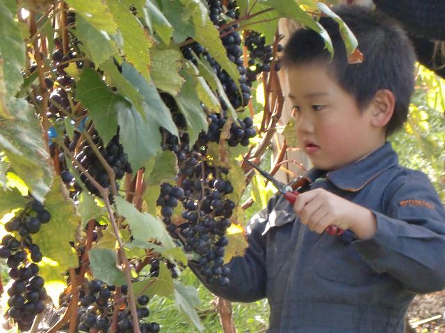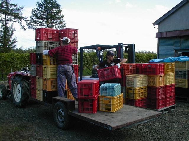 10月12日 『セイベルの収穫日』 朝7時より、総勢14人、それと孫の駿太君の手も?かりて、5300㎏を収穫しました。 セイベルは、私の作っている品種の中では一番収穫しずらく はかどらないぶどうです。 10月16、17日 『ツバイゲルトレーべの収穫』 この日は、暖かい日だったので、皆、汗をかきながら一生懸命収穫してくれました。 皆、手分けをしながらそれぞれの仕事をこなし 大型トラックで、小樽の北海道ワインの工場へと 運ばれていきました。 きっと、おいしいワインが出来上がるでしょう・・・・・ 今日は、ケルナーを収穫し始めました。 後はピノノアールへと続きます。