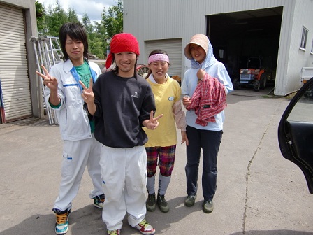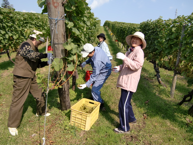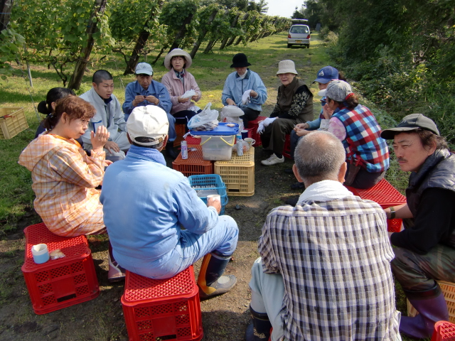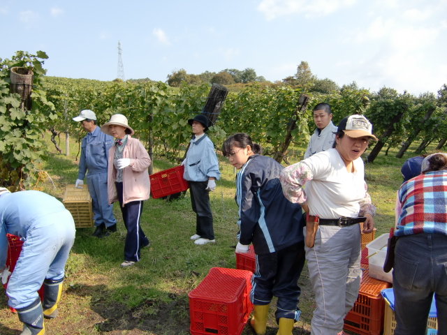 奈良県五條高校 賀名生分校生徒 8名が余市での農業実習を始めました。 今年で44年目となりますが、長く続いている余市とのお付き合い、 本当にすばらしい事だと思います。 当園にも、池下君・中谷君が慣れない仕事に勢を出しています。(ワイン用ぶどうのわき目とり) 身体に気をつけて、10日間頑張って下さいね!!